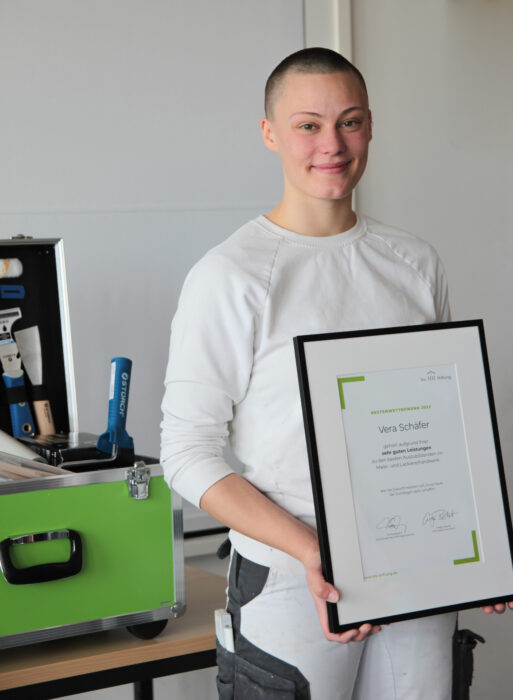 Sie hatte diesen zusammen mit einem Tablet, als eine der bundesweit 100 besten Azubis der diesjährigen Abschlussklassen im Maler- und Lackiererhandwerk gewonnen. Ausrichter und Sponsor dieses Wettbewerbs ist die Stiftung der Firma STO, einer der großen Hersteller von Beschichtungsstoffen. In Anwesenheit des stellvertretenden Schulleiters Herrn Keune, des gewerblichen Bereichsleiters Herrn Nahstoll, des Klassenleiters Herrn Hoffmann, Fachlehrerin Frau Neeb, Herrn Oppinger vom Ausbildungsbetrieb Oppinger sowie den Auszubildenden des 1. Lehrjahrs gab es eine kleine Feier.