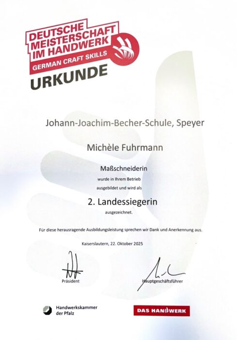Wir sind besonders stolz auf die Leistungen von Frau Fuhrmann, die mit ihrem Talent und Engagement nicht nur sich selbst, sondern auch unsere Schule und das pfälzische Handwerk repräsentieren. Diese Auszeichnung ist ein Beweis für ihre harte Arbeit und ihr Durchhaltevermögen. Ebenfalls wurden wir als Schule für unsere Ausbildung im Bereich Maßschneiderei ausgezeichnet, worüber wir uns sehr freuen.