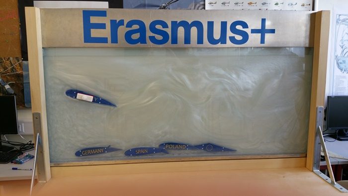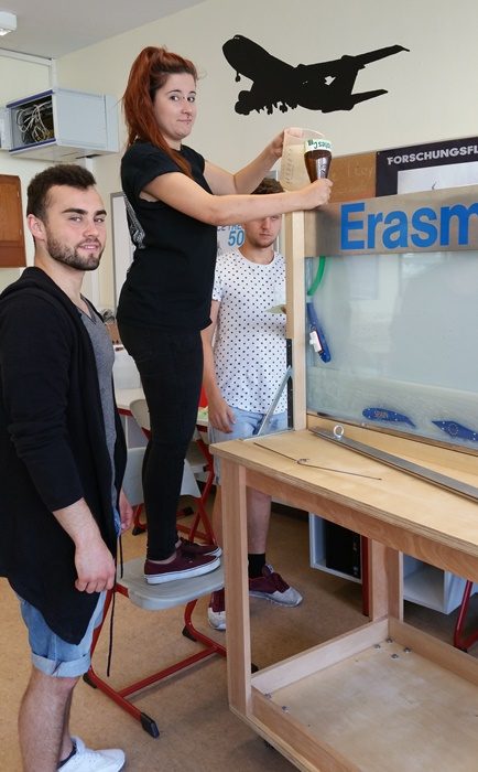 Dieser Erfolg basiert nicht zuletzt auf einer konstruktiven, länderübergreifenden Zusammenarbeit, bei der jeder Projektpartner seine spezifischen Aufgaben zu lösen hatte. So wird unsere Glasbox von der Rückseite durch ein LED-Panel optimal beleuchtet. Diese Beleuchtung wurde von der türkischen Schule entwickelt und bereitgestellt. Die Herstellung der verschiedenen Profile (z.B. Tragflügelprofil) war Aufgabe der polnischen Partner. Die im Projekt beteiligte spanische Schule stellte wiederum das Design für das Gestell zur Verfügung. Das Design und der Zusammenbau der Glasbox wurde ebenso von uns in Speyer durchgeführt, wie die Entwicklung einer speziellen Flüssigkeit zur Sichtbarmachung der Strömungsphänomene (Wasser+Glycerin+X).